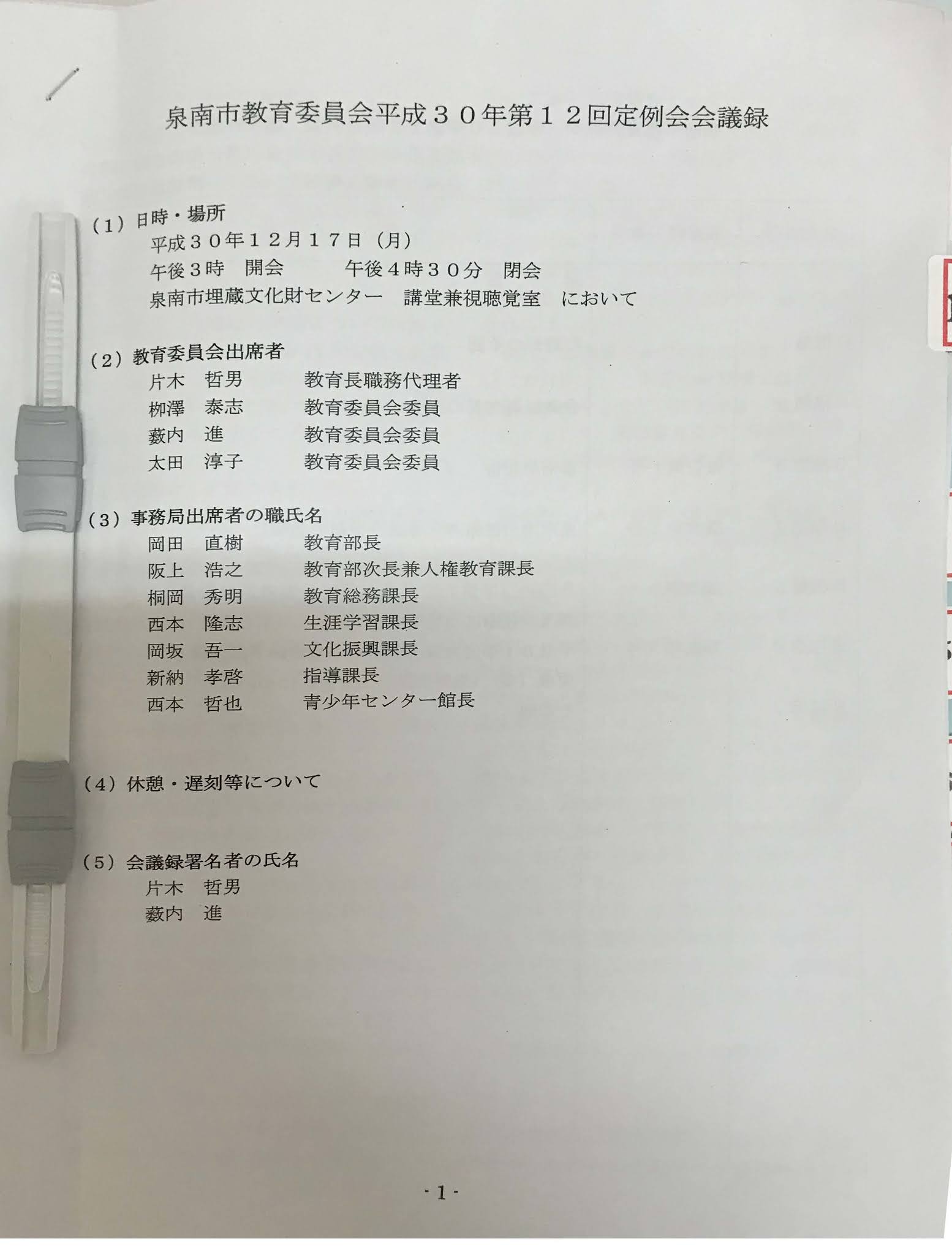 泉南市教育委員会、平成30年(註:31年)第1回定例会会議録をいただいたんですよね。これはどういうふうにしていただいたかというと、学校プールを全廃するようなことを決めた会議録を出してくださいというふうに言うたら、これが出てきたんです。